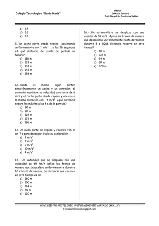 Este documento presenta 10 preguntas sobre conceptos básicos de movimiento rectilíneo uniformemente variado (MRUV), incluyendo aceleración, velocidad, desaceleración y distancia. Las preguntas cubren temas como aceleración constante, desaceleración uniforme, y cálculos para determinar distancias y tiempos dados valores de velocidad y aceleración. El documento parece ser parte de una evaluación o examen sobre los fundamentos de la física del MRUV.