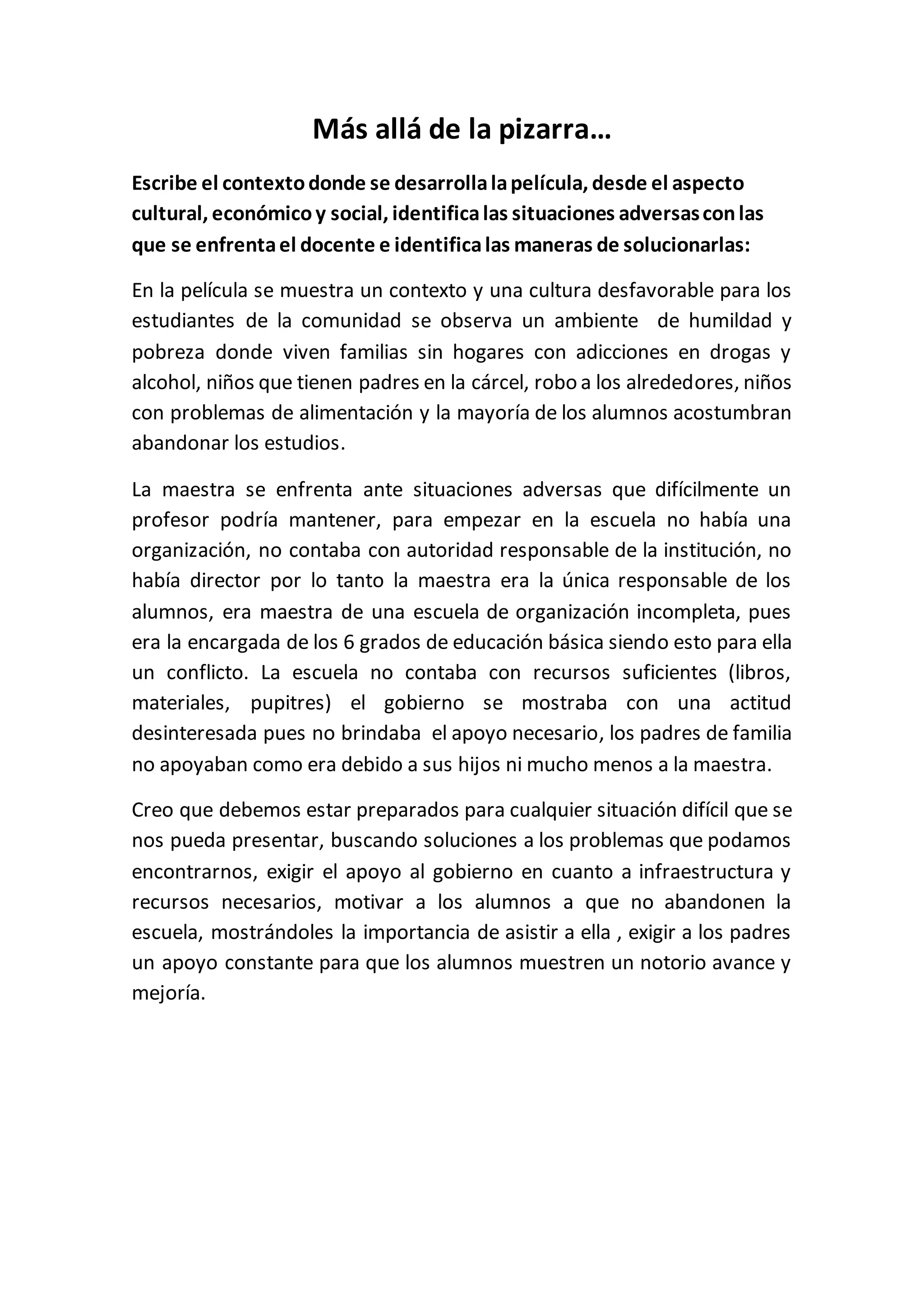 El documento describe el contexto desfavorable mostrado en la película, con familias pobres y niños que enfrentan problemas como la falta de alimentos, padres en prisión y el abandono escolar. La maestra se enfrenta a situaciones adversas como carecer de autoridad escolar, recursos insuficientes y falta de apoyo de los padres y el gobierno. Se recomienda que los maestros estén preparados para enfrentar cualquier situación difícil, busquen soluciones a los problemas y motiven a los estudiantes a no abandonar la escuela.