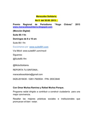 Este programa radial se enfoca en promover la ciudadanía y el bienestar social a través de historias ejemplares. Incluye noticias sobre eventos como la Batalla de Carabobo y el nacimiento de figuras como Ernesto Sabato y Salvador Allende. También presenta la biografía de Jesús Enrique Lossada, considerado el padre de la Universidad del Zulia, y la muerte del cantante Héctor Lavoe.