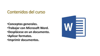 Este documento proporciona información sobre el curso básico de Microsoft Word. Explica los conceptos generales de Word, cómo acceder al programa y los elementos clave de la interfaz como la barra de menú, barra de herramientas y barra de estado. También cubre cómo crear y guardar documentos, aplicar formatos, desplazarse por un documento usando las barras de desplazamiento y realizar acciones como copiar, pegar y buscar texto. El documento proporciona instrucciones e imágenes para ayudar a los estudiantes a apre