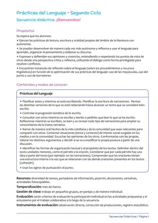 Este documento presenta una secuencia didáctica para el segundo ciclo de primaria sobre el tema de la comunicación. Los objetivos son que los estudiantes desarrollen sus habilidades de lectura, escritura y oralidad de manera autónoma y reflexiva, expresen sus opiniones respetando los puntos de vista de los demás, y encuentren instancias para mejorar su uso del lenguaje. La secuencia incluye actividades como presentaciones, análisis de formas de comunicación, discusión del concepto de comunicación, y ejercicios sobre el uso