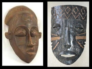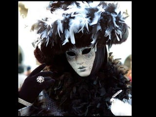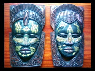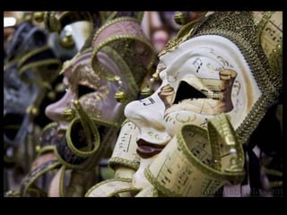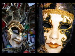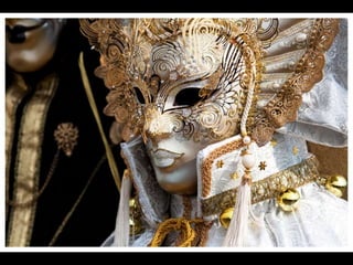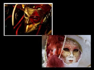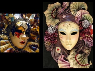 El documento describe brevemente diferentes tipos de máscaras utilizadas en varias culturas y épocas como Egipto, Grecia, África, Venecia, Japón e Incas. Incluye información sobre el material, época y lugar de conservación de algunas máscaras importantes como la máscara funeraria de Tutankhamón del Museo de El Cairo y la máscara de Agamenón del Museo Arqueológico Nacional de Atenas.