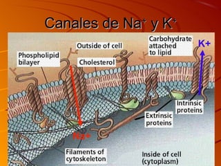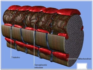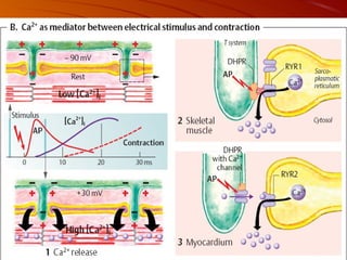 El documento trata sobre células excitables como el músculo esquelético, cardiaco y liso. Explica la propagación del potencial de acción a través de canales de sodio y potasio, y la transmisión en la placa neuromuscular. También cubre temas como receptores para neurotransmisores como el glutamato, lípidos omega 3, estructura de la sarcómera, canales de calcio, y regulación de la contracción muscular cardíaca y vascular.