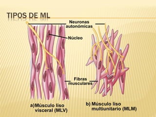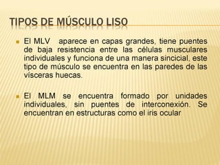 El documento describe la fisiología muscular. 1) Las fibras musculares esqueléticas, cardíacas y lisas difieren en su localización, uniones, automatismo y regulación. 2) La contracción muscular ocurre cuando el calcio se une a la calmodulina, activando la miosina cinasa y permitiendo la unión de actina y miosina. 3) La relajación ocurre cuando el calcio es bombeado fuera de la célula y la miosina fosfatasa rompe el complejo actina-miosina.