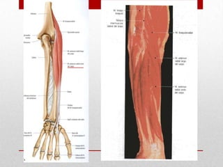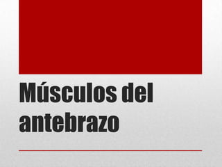 Este documento describe los principales músculos de la región anterior, posterior y externa del antebrazo. En la región anterior se encuentran el flexor superficial de los dedos, el flexor largo propio del pulgar, el flexor profundo de los dedos y el pronador cuadrado. En la región posterior están el extensor cubital del carpo, el ancóneo y el abductor largo del pulgar. La región externa incluye el supinador corto y los dos radiales externos.