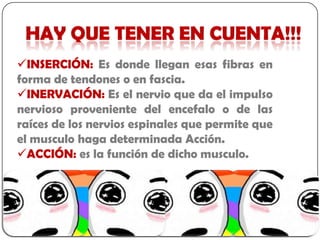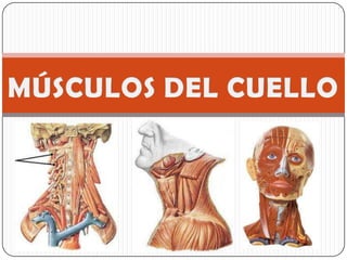 Este documento describe los músculos del cuello, incluyendo su ubicación, inervación e inserción. Los músculos del cuello se dividen en tres regiones y comprenden músculos superficiales y profundos. También describe los músculos del grupo infrahioideo y suprahioideo que controlan el movimiento de la laringe y el hueso hioides.