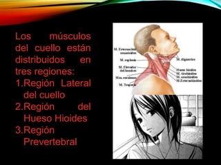 Este documento describe los músculos del cuello, dividiéndolos en tres regiones: lateral, hueso hioides y prevertebral. Explica cada músculo de estas regiones, incluyendo su inervación, acción e inserciones. En total, describe más de 20 músculos del cuello individualmente.