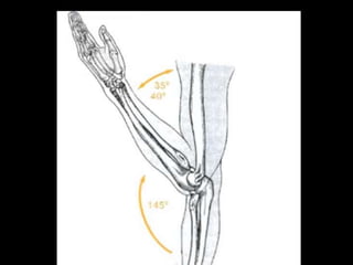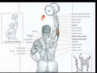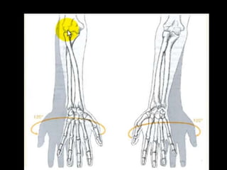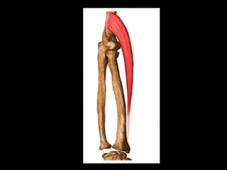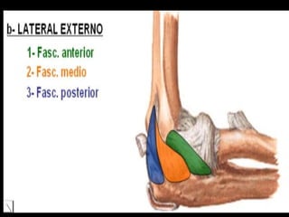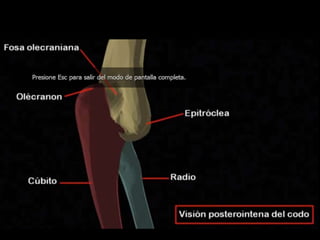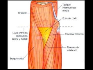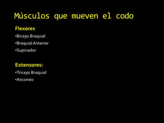 Este documento describe los músculos que mueven el codo, incluyendo el bíceps braquial, el tríceps braquial, el supinador largo y el anconeo. Describe las inserciones, inervación y acción de cada músculo. También describe la fosa del codo y sus estructuras contenidas como vasos sanguíneos y tendones.