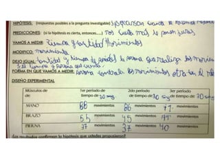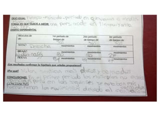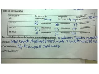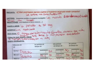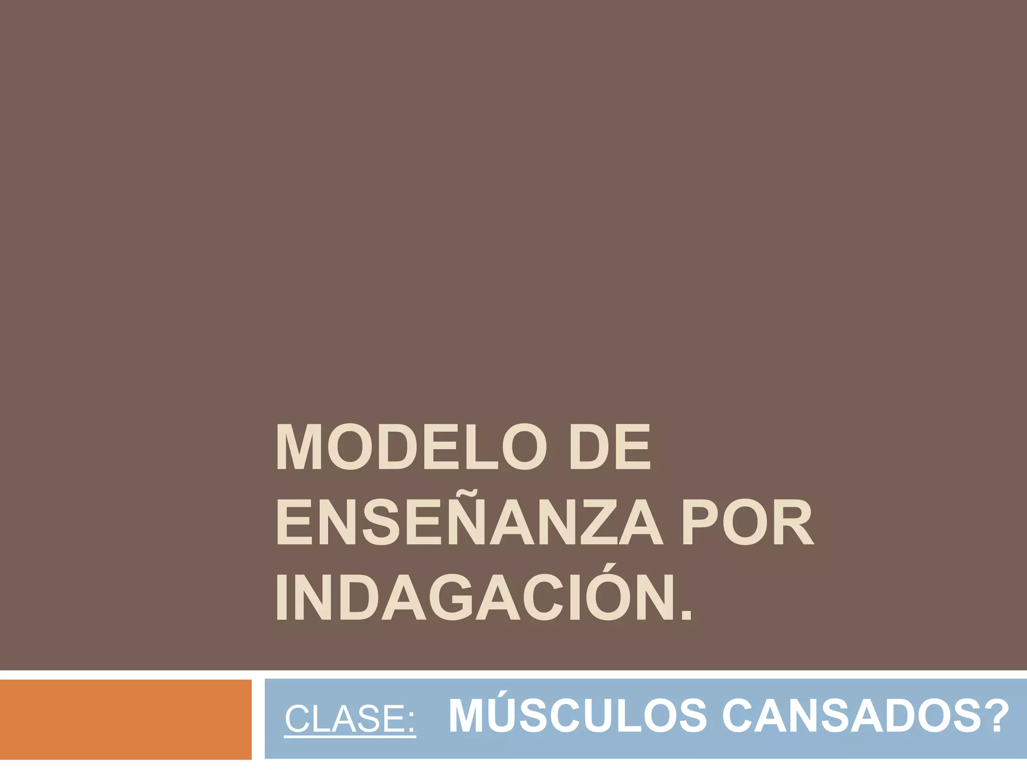 Este documento describe una lección sobre los músculos cansados utilizando el modelo de enseñanza por indagación. La clase comenzó con una discusión sobre los músculos y luego los estudiantes formularon hipótesis y predijeron cómo podrían darse cuenta si sus músculos estaban cansados. Luego diseñaron un experimento para probar sus hipótesis, midiendo el número de movimientos que podían hacer en períodos sucesivos. Finalmente, los estudiantes compartieron sus resultados y concluyeron que sus músculos se cans