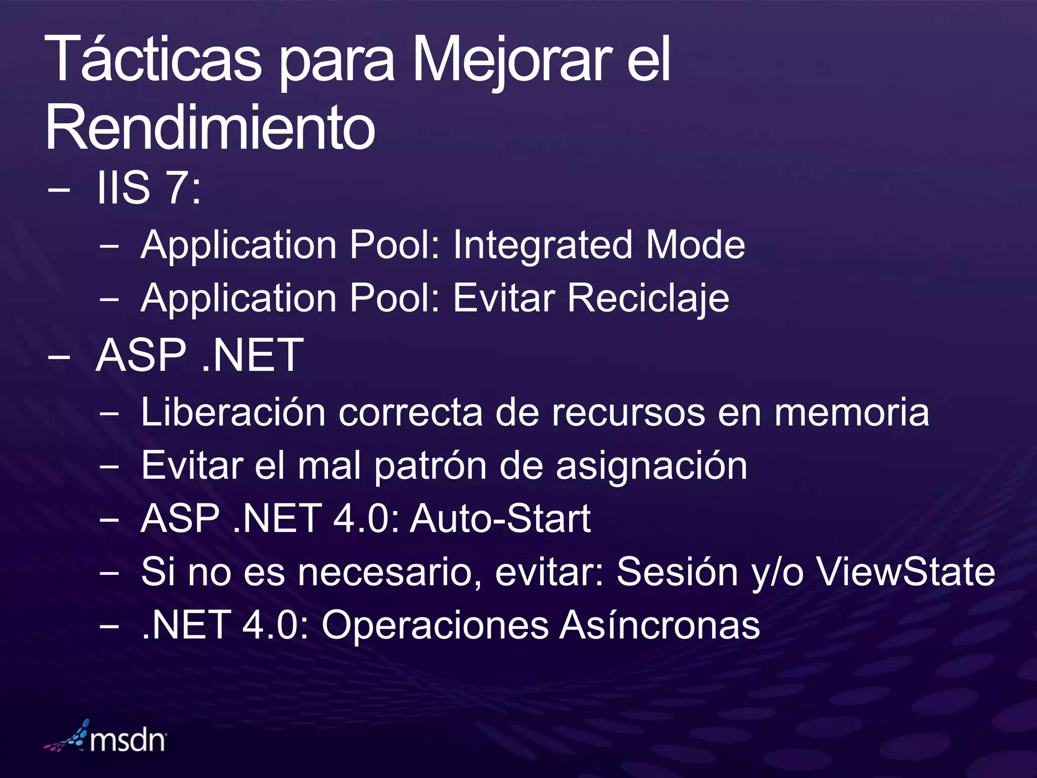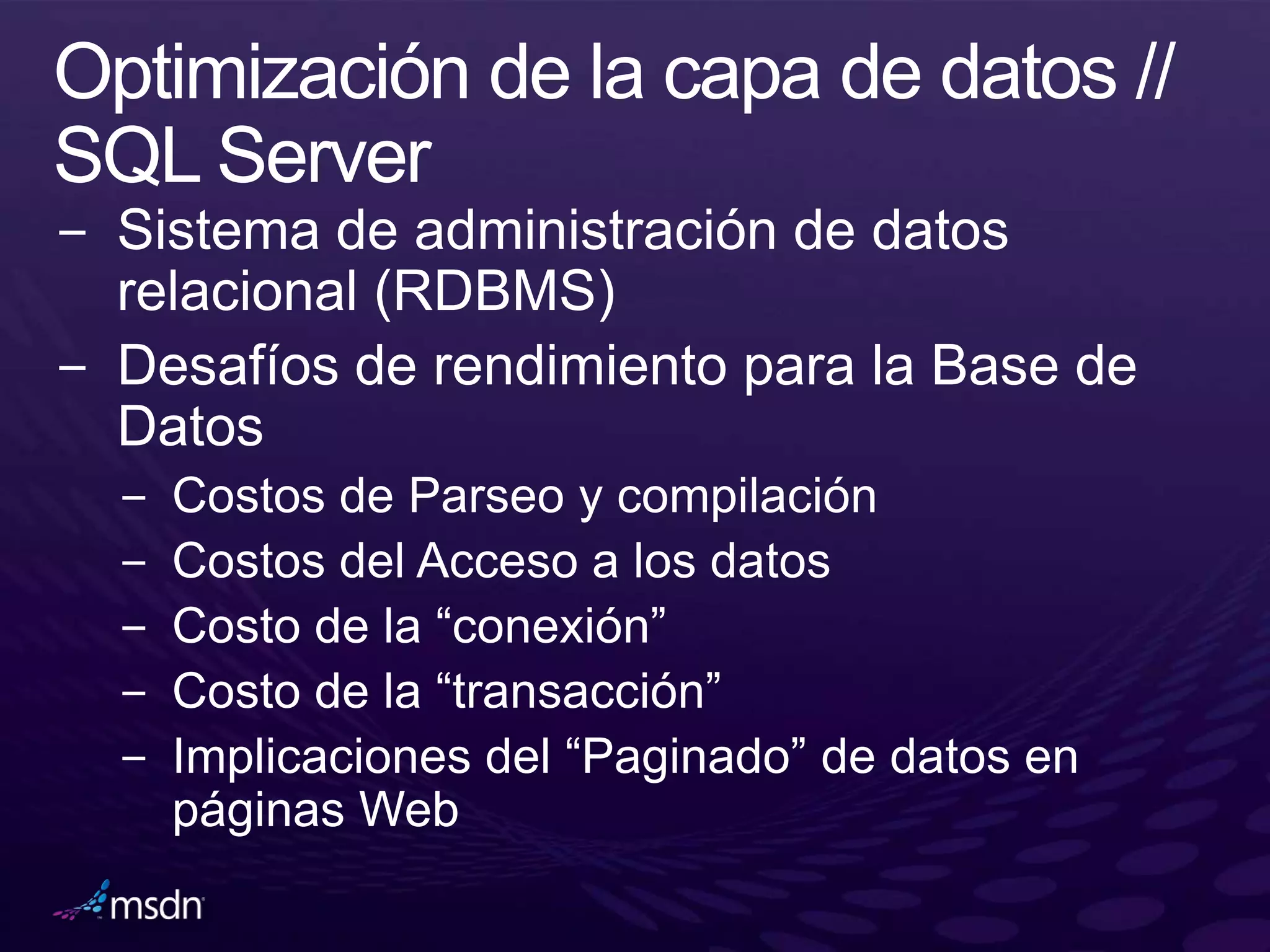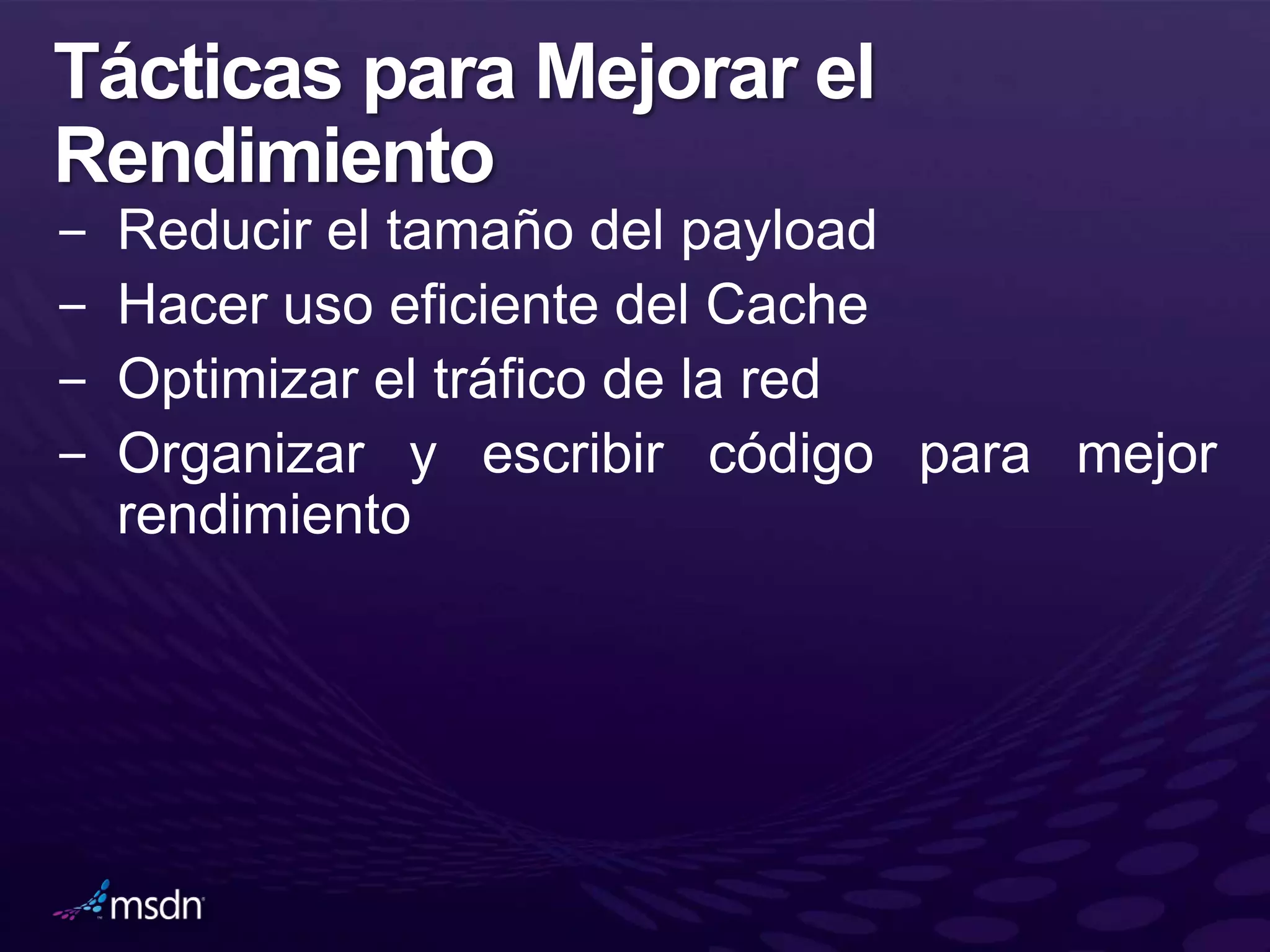 Este documento habla sobre la optimización del rendimiento en la web. Menciona que factores como tiempos de carga lentos, patrones de asignación ineficientes y fugas de memoria pueden afectar negativamente el rendimiento. También proporciona herramientas y técnicas para analizar y mejorar problemas de rendimiento, como Fiddler y el uso eficiente del cache de consultas en SQL Server.