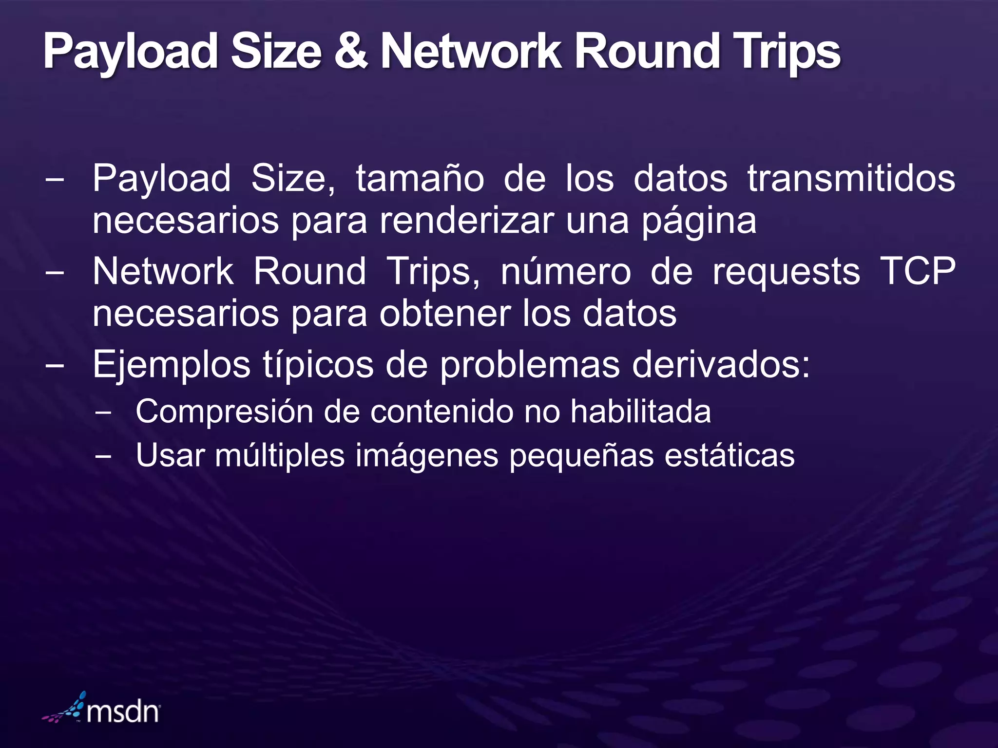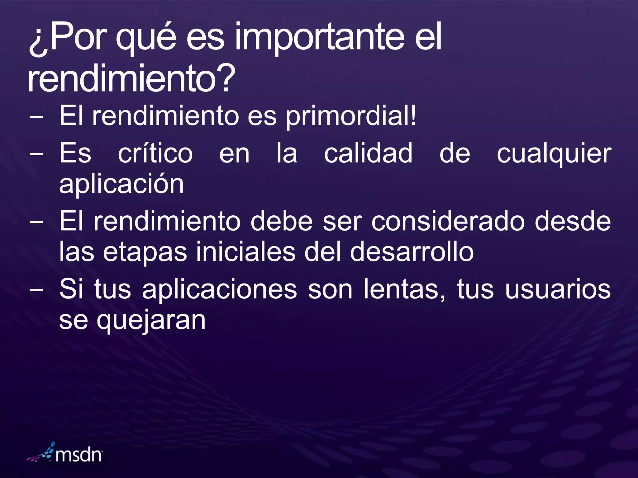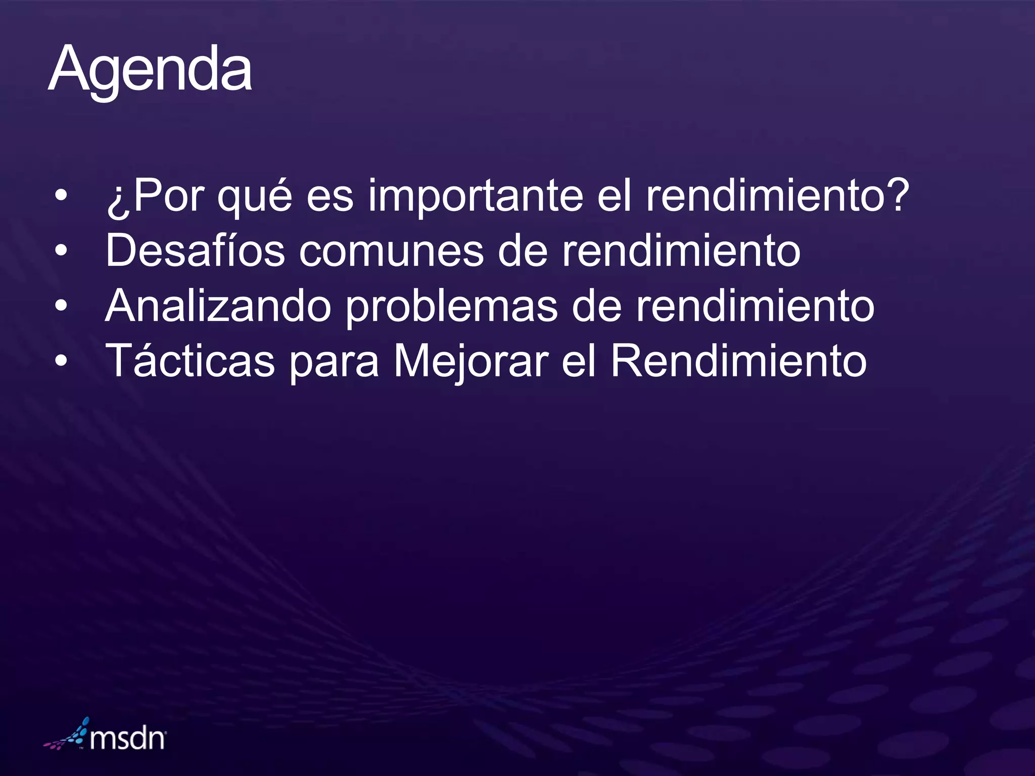 Este documento habla sobre la optimización del rendimiento en la web. Menciona que factores como tiempos de carga lentos, patrones de asignación ineficientes y fugas de memoria pueden afectar negativamente el rendimiento. También proporciona herramientas y técnicas para analizar y mejorar problemas de rendimiento, como Fiddler y el uso eficiente del cache de consultas en SQL Server.