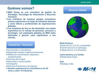 El documento proporciona información sobre las capacidades de MSH Group, una consultora global de gestión, tecnología e información y recursos humanos. MSH Group ofrece servicios de consultoría en estrategia, TI, y recursos humanos a través de equipos con experiencia en diversas industrias. La compañía tiene presencia global en Norteamérica, Latinoamérica, el Caribe y Asia. El documento también presenta brevemente al equipo ejecutivo de MSH Group y algunos ejemplos de proyectos de consultoría realizados en Am