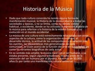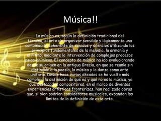 El documento presenta una definición tradicional de la música como el arte de organizar sonidos y silencios utilizando principios como la melodía, armonía y ritmo. Luego, discute brevemente la evolución del concepto de música y la expansión de sus límites por compositores contemporáneos. Finalmente, resume la historia de la música como una manifestación cultural universal presente en todas las sociedades a lo largo de la historia y destaca a cuatro grandes músicos: Beethoven, Mozart, Bach y Vivaldi.
