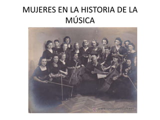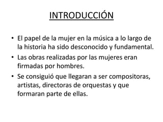 El papel de la mujer en la historia de la música ha sido desconocido y fundamental a pesar de la discriminación de género. A lo largo de los períodos históricos, las mujeres se enfrentaron a barreras para componer, tocar instrumentos y dirigir orquestas, aunque hubo compositoras pioneras como Hildegarda de Bingen en la Edad Media y Francesca Caccini en el Renacimiento. En los siglos XIX y XX, las mujeres lucharon por obtener títulos musicales y reconocimiento, aunque todavía enfrentan