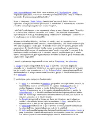 El documento define la música como el arte de organizar sonidos y silencios de manera coherente utilizando principios como la melodía, armonía y ritmo. Explica que la música es un producto cultural que busca provocar una experiencia estética en el oyente y expresar sentimientos. También describe los elementos básicos de la música como el sonido, altura, duración, intensidad y timbre, así como conceptos como melodía, armonía y ritmo.