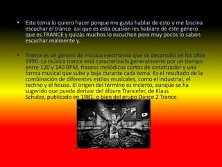 El documento habla sobre el género musical trance. Explica que el trance se desarrolló en los años 1990 y se caracteriza por un tempo entre 120 y 140 BPM, fraseos melódicos cortos de sintetizador y una forma musical que sube y baja. También menciona algunos de los orígenes e influencias del trance como el techno, house y música industrial, así como algunos de los principales subgéneros y DJs asociados con el trance.