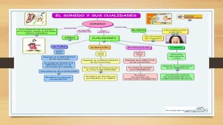 El documento define la música como el arte de dotar a los sonidos y silencios de organización, y describe sus elementos básicos. Explica que la música se compone de sonidos y silencios, y que los sonidos pueden ser determinados (musicales) o indeterminados (ruidos). También describe las características de los sonidos determinados e indeterminados, y los elementos de la música como el ritmo, métrica, melodía y armonía.
