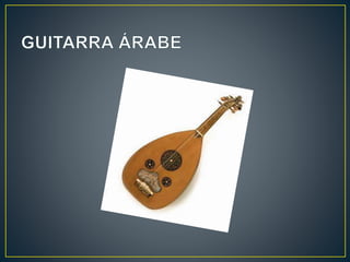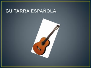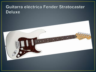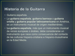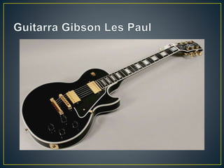 Este documento describe la historia y características de diferentes tipos de guitarras, incluyendo la guitarra española de origen mediterráneo, la guitarra eléctrica que amplifica las vibraciones de sus cuerdas mediante pastillas electromagnéticas, y las compañías Fender y Gibson, pioneras en la fabricación masiva y comercialización de guitarras eléctricas como la Fender Telecaster, Stratocaster y Gibson ES-150, la primera guitarra eléctrica española.