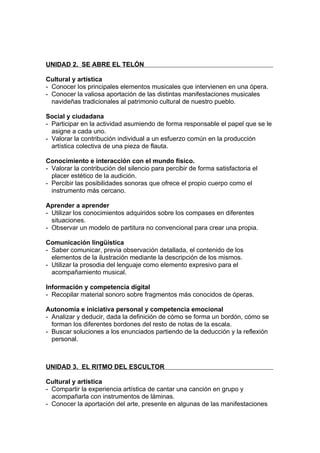 Este documento presenta seis unidades de estudio sobre música. Cada unidad incluye objetivos relacionados con diferentes áreas como cultura y arte, matemáticas, comunicación, autonomía personal y más. Los objetivos incluyen conocer el legado cultural de la música clásica, identificar elementos musicales en óperas, desarrollar habilidades de razonamiento rítmico, y utilizar la tecnología para investigar compositores famosos.