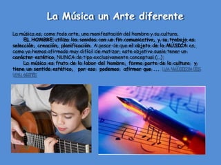 Este documento discute que la música es un arte diferente. Explica que la música es una manifestación de la cultura humana que utiliza los sonidos con un propósito estético y comunicativo. A diferencia de las artes plásticas como la pintura y la escultura que usan materiales tangibles en el espacio de dos o tres dimensiones, la música usa sonidos inmateriales que se desarrollan en el tiempo. Por lo tanto, la música se considera un arte del tiempo.