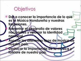El documento describe la importancia de la música y el folclore hondureños. Explica que la música refleja la identidad nacional y los valores culturales del país. Luego resume la evolución de la música a través de los períodos de conquista, colonial e independencia. También describe varios instrumentos musicales, géneros y compositores importantes de Honduras. Finalmente, enfatiza que el verdadero folclore surge de la gente humilde y expresa sus sentimientos a través de canciones, danzas y tradiciones.