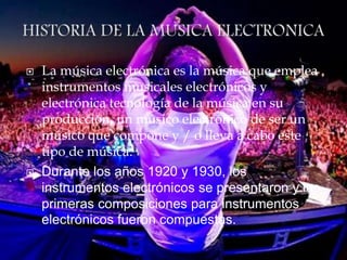 La música electrónica utiliza instrumentos y tecnología electrónica y se ha vuelto popular entre los jóvenes. En las décadas de 1920 y 1930 se introdujeron los primeros instrumentos electrónicos y composiciones para ellos. Algunos de los festivales más grandes de música electrónica son Ultra Music Festival, Tomorrowland, Creamfields, Electric Daisy Carnival y Boom Festival. Summerland es un festival al aire libre de música electrónica que tiene lugar anualmente en enero en Cartagena, Colombia.