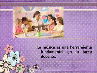 La música es una forma de expresión que forma parte de la vida humana y crea emociones. Además de ser divertida, la música mejora el desarrollo cerebral y habilidades como la lectura y las matemáticas. La música en la educación inicial tiene un impacto positivo en el desarrollo sensorial, motor, intelectual y de audición de los niños. Ayuda a mejorar la coordinación, concentración, capacidad de aprendizaje, memoria y otras habilidades.