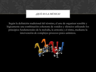 El documento define la música como el arte de organizar sonidos y silencios mediante la melodía, armonía y ritmo. Explica que existen muchos géneros musicales como el blues, rock, pop, clásica, entre otros. Además, señala que la música se compone de sonidos y silencios, y que los parámetros fundamentales del sonido son la altura, duración, intensidad y timbre. Por último, menciona que los elementos básicos de la música son la melodía, armonía, métrica y ritmo.