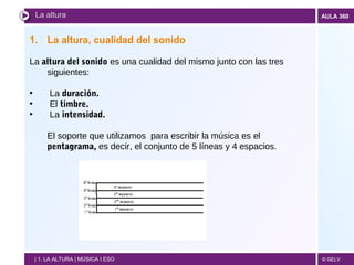 Este documento explica los conceptos básicos de la altura en música. Define la altura como una cualidad del sonido y describe el pentagrama y las claves de sol y fa usadas para representar la altura. Explica los intervalos, la distancia entre sonidos medida en tonos y semitonos, y las alteraciones como sostenidos, bemoles y becuadros que modifican la altura de las notas.