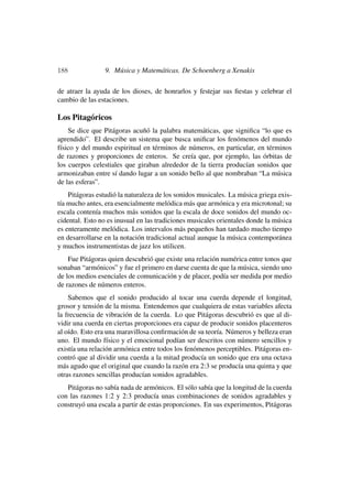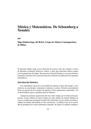 Este documento presenta una historia de la relación entre la música y las matemáticas desde los pitagóricos hasta el siglo XX. Introduce conceptos como los tetracordios griegos, los modos musicales y rítmicos, y el desarrollo del temperamento igual en la música occidental. Explica cómo Pitágoras descubrió las proporciones matemáticas entre los intervalos musicales y cómo esto influyó en la teoría musical griega y más allá.
