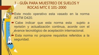 Este documento proporciona guías para el muestreo de suelos y rocas según la norma MTC E 101-2000. Explica los procedimientos para determinar el perfil del subsuelo mediante perforaciones, calicatas y métodos geofísicos. Detalla los tipos de aparatos de muestreo, los ensayos de laboratorio requeridos para clasificar los materiales y los pasos para la interpretación de resultados. El objetivo es obtener muestras representativas para caracterizar las propiedades de los suelos y rocas en un proyecto de ingenier