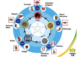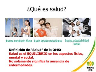 El documento habla sobre la medicina tradicional china y la salud. Define la salud como un equilibrio físico, mental y social, no solo la ausencia de enfermedades. Describe los cuatro factores de la salud como nutrición equilibrada, ejercicio adecuado, mente saludable y suficiente descanso. También identifica tres preocupaciones comunes de salud en adultos: osteoporosis, enfermedades cardiovasculares y falta de inmunidad. Finalmente, recomienda algunos productos Tiens para abordar estas preocupaciones.
