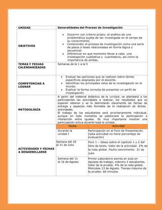 Este documento presenta el plan docente para la Unidad I sobre generalidades del proceso de investigación. Los objetivos son discernir críticamente una problemática sujeta a investigación, comprender el proceso de investigación como una serie de pasos secuenciales, y diferenciar entre investigaciones cualitativas y cuantitativas. Se incluyen temas, competencias, metodología, actividades y fechas. Las actividades consisten en foros, laboratorios escritos individuales y en equipo, y un examen parcial.