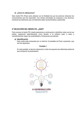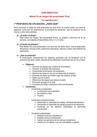 Este documento presenta una guía didáctica para el uso del medio Prezi con estudiantes de 6o grado para enseñar sobre la reproducción humana. La guía incluye 12 diapositivas de Prezi con varias actividades interactivas como emparejar términos, identificar afirmaciones como verdaderas o falsas, y completar oraciones. El objetivo es reforzar los conceptos clave de una manera dinámica y entretenida para los estudiantes.