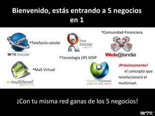Este documento promueve un negocio multinivel que ofrece cinco negocios en uno relacionados con telefonía celular, comunidad financiera, mall virtual y más. Se describe un plan de compensación que permite ganar dinero reclutando a otros y por el consumo de tiempo aire de la red. También se promueve la venta de tiempo aire a través de puntos de venta como negocios y la posibilidad de ganar comisiones por la venta y membresías de otros.