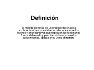 El documento describe el método científico, que incluye observación, planteamiento de un problema, formulación de una hipótesis, predicción de resultados, experimentación, análisis de datos y conclusión. El método científico es un proceso para explicar fenómenos naturales mediante la observación sistemática, la formulación de hipótesis y la experimentación.