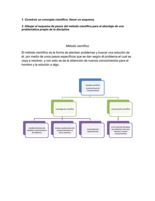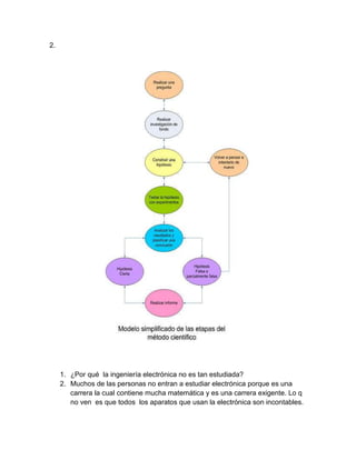 El documento describe los pasos del método científico para abordar una problemática, incluyendo construir un concepto científico y hacer un esquema. Luego discute por qué la ingeniería electrónica no es tan estudiada, señalando que contiene mucha matemática y es exigente, pero que los aparatos electrónicos son incontables y sirven para ahorrar tiempo y esfuerzo.