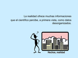 El documento describe el proceso inductivo-deductivo de la ciencia. Los científicos observan datos desorganizados de la realidad, elaboran hipótesis mediante inducción, y luego generan teorías, leyes y modelos a través de deducción. Estas teorías se contrastan con la realidad para reanudar el proceso. Sin embargo, los prejuicios e intereses de los científicos como seres humanos influyen en cada etapa del proceso, lo que puede dar lugar a diferentes interpretaciones de los datos y conclusiones dependiendo de la perspectiva