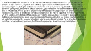 El método científico consiste en la observación sistemática, medición, experimentación y modificación de hipótesis. Se basa en dos pilares: la reproducibilidad de experimentos y la refutabilidad de proposiciones científicas. No existe un único método científico, sino un conjunto de tácticas como métodos definitorios, clasificatorios y estadísticos que constituyen el conocimiento científico.