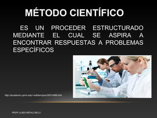 El documento describe las etapas del método científico, que incluyen la observación, planteamiento del problema, hipótesis, diseño experimental, análisis de resultados y conclusiones. El método científico es un proceso sistemático utilizado para investigar problemas mediante la observación, prueba de hipótesis y análisis de datos.