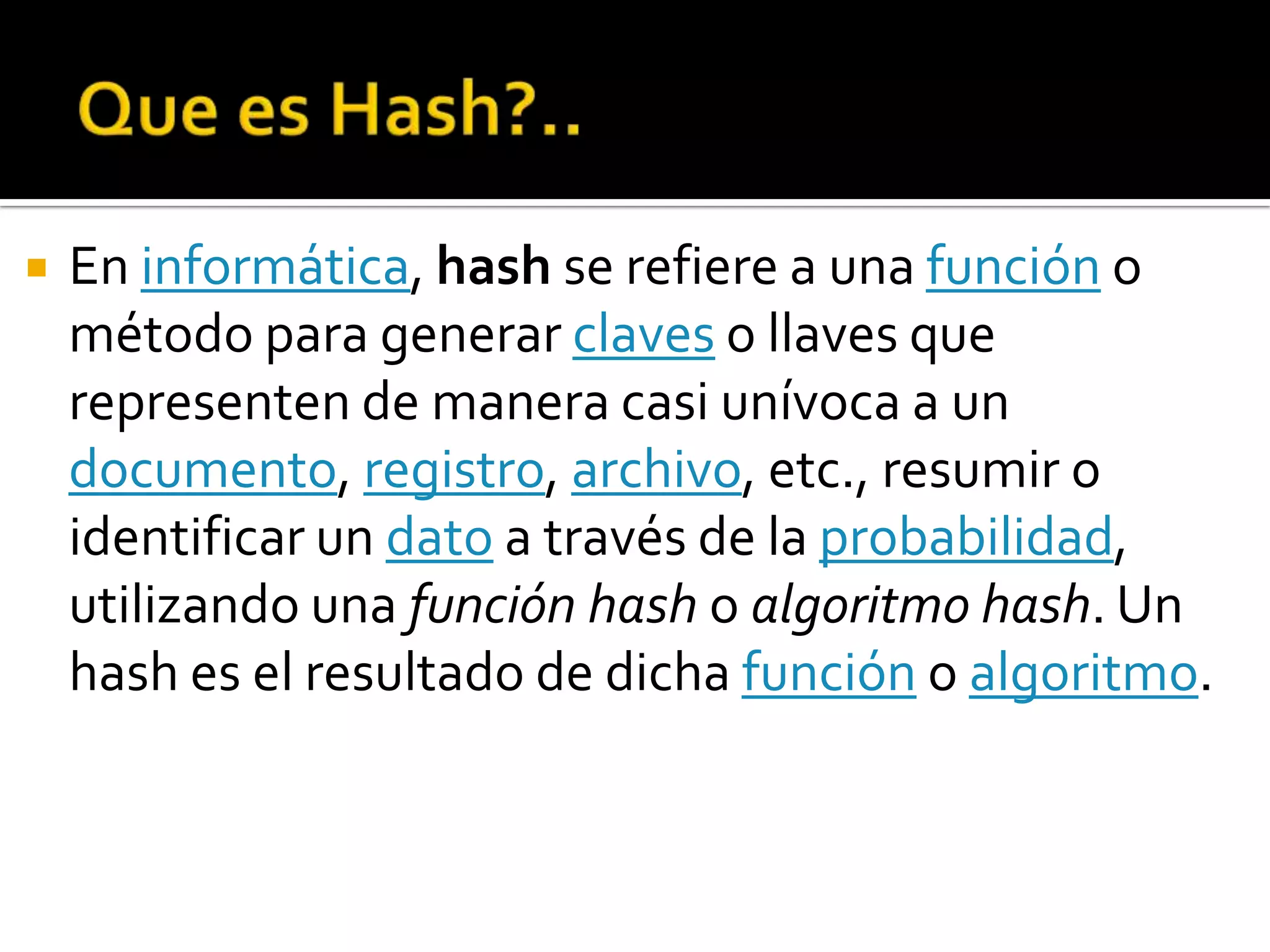 Un hash es el resultado de aplicar una función matemática a un documento u objeto para generar una clave única que lo represente de forma concisa. Las funciones hash se usan comúnmente en tablas hash para acelerar la búsqueda de información mediante el mapeo casi directo de claves a ubicaciones de memoria. Una buena función hash distribuye las claves de forma aleatoria para minimizar las colisiones donde claves diferentes generan la misma salida.