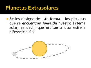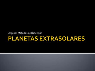 Este documento describe varios métodos para detectar exoplanetas, incluyendo el tránsito, la velocidad radial y el análisis espectral. El método de tránsito observa los cambios en la curva de luz de una estrella cuando un planeta pasa frente a ella. El método de velocidad radial mide el corrimiento Doppler de una estrella debido a la gravedad de un planeta. El análisis espectral observa cómo los colores de una estrella se mueven a medida que un planeta orbita alrededor.
