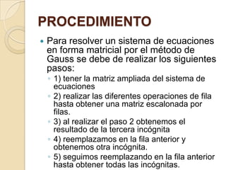 El método de Gauss consiste en encontrar una matriz ampliada escalonada equivalente al sistema original mediante operaciones de fila. Esto permite escribir el sistema equivalente y resolverlo para obtener las incógnitas. Si la matriz resultante tiene una fila de ceros, el sistema es inconsistente o tiene infinitas soluciones. El método involucra obtener la matriz ampliada, escalonarla por filas mediante operaciones, y reemplazar valores en filas superiores para hallar cada incógnita de forma secuencial.