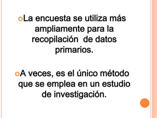 El documento describe el método de la encuesta, que recolecta información de un grupo de personas seleccionado de manera sistemática. Las encuestas se usan ampliamente para recopilar datos primarios y a veces son el único método empleado en un estudio de investigación. Proporcionan información confiable de manera sencilla, flexible y a bajo costo.
