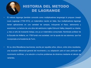 El método de Lagrange es un procedimiento para encontrar máximos y mínimos de funciones sujetas a restricciones. Reduce el problema restringido a uno sin restricciones mediante la adición de términos multiplicados por "multiplicadores de Lagrange". Estos multiplicadores representan la tasa de cambio en la utilidad relativa al cambio en la restricción. El método se aplica en optimización, física, economía y otras áreas para determinar valores óptimos dados límites o restricciones.