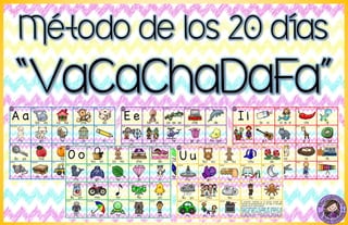 Este documento describe un método de lectoescritura llamado "VaCaChaDaFa" que enseña a los niños las sílabas y palabras en 20 días. Comienza con láminas que presentan sílabas como "ba", "ca", y "cha" junto con imágenes. Los estudiantes repiten cada sílaba tres veces y forman palabras con ellas. El método sigue un orden lógico y las sílabas son unidades sonoras fáciles de aprender, aunque algunos lo consideran mecánico. El documento incluye instrucciones detalladas