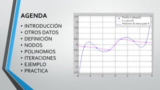 El método de Neville es un algoritmo para la interpolación polinómica que permite construir polinomios de grado n a partir de nodos dados de forma recursiva, a diferencia del método de Lagrange. Utiliza la forma de polinomio de interpolación de Newton y la relación de recursión de diferencias divididas para generar polinomios de grado superior a partir de los inferiores. El documento incluye ejemplos prácticos y tablas que ilustran el proceso de interpolación.