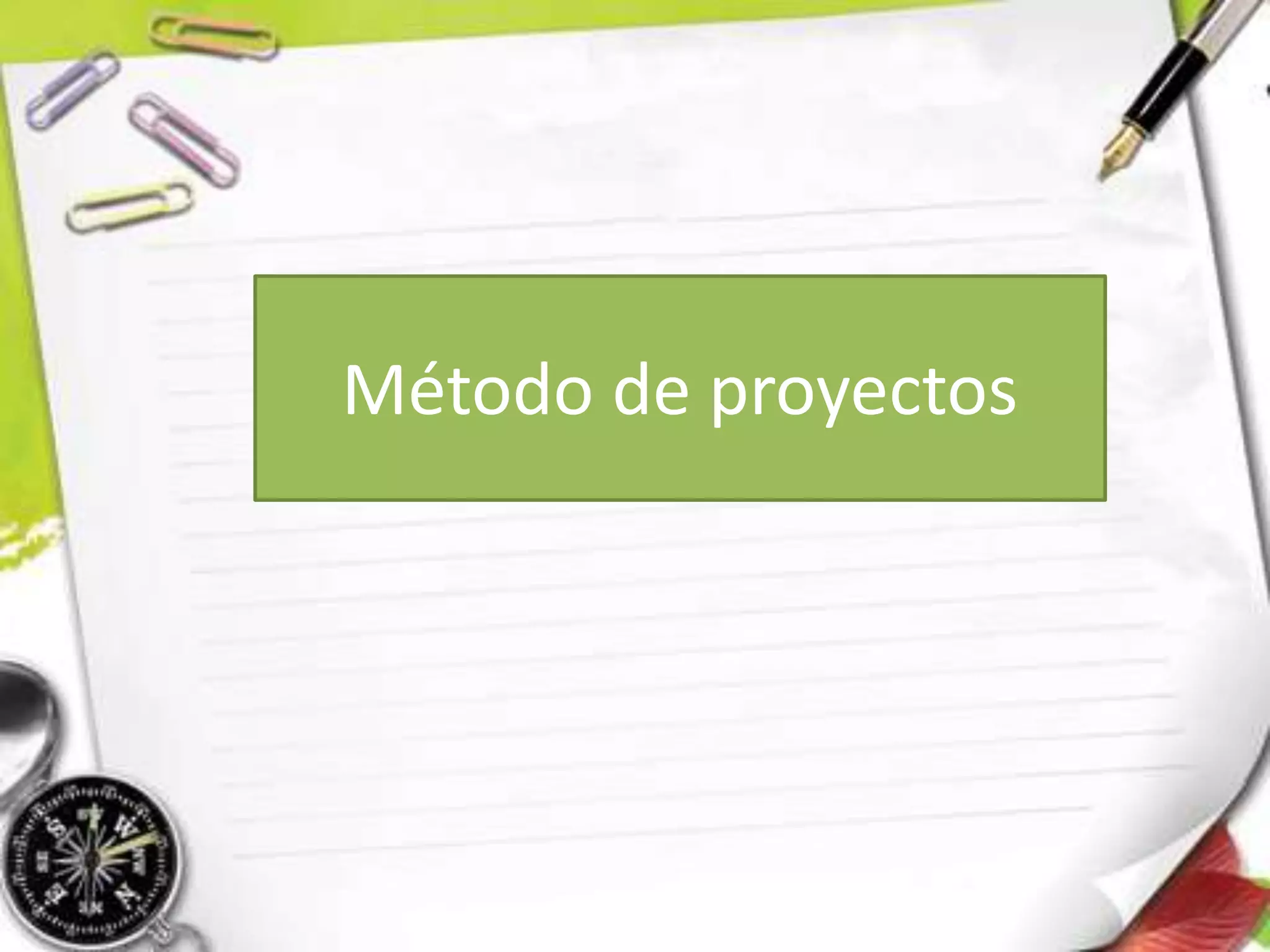 El método de proyectos es una estrategia de aprendizaje centrada en conceptos clave y principios de una disciplina. Involucra a los estudiantes en la solución de problemas y tareas significativas para construir su propio aprendizaje, culminando en resultados generados por ellos mismos. Se compone de etapas como la definición del proyecto, planificación, ejecución, evaluación y conclusión, donde los estudiantes desarrollan habilidades a través de un aprendizaje colaborativo.