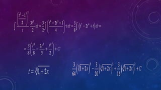 El documento describe el método de integración por sustitución o cambio de variable, el cual se basa en la derivada de la función compuesta. Este método implica identificar la parte de la integral que se va a cambiar por una nueva variable, diferenciar ambos términos, y sustituir en la integral original para obtener una integral más sencilla de resolver. Se provee un ejemplo para ilustrar los pasos a seguir.