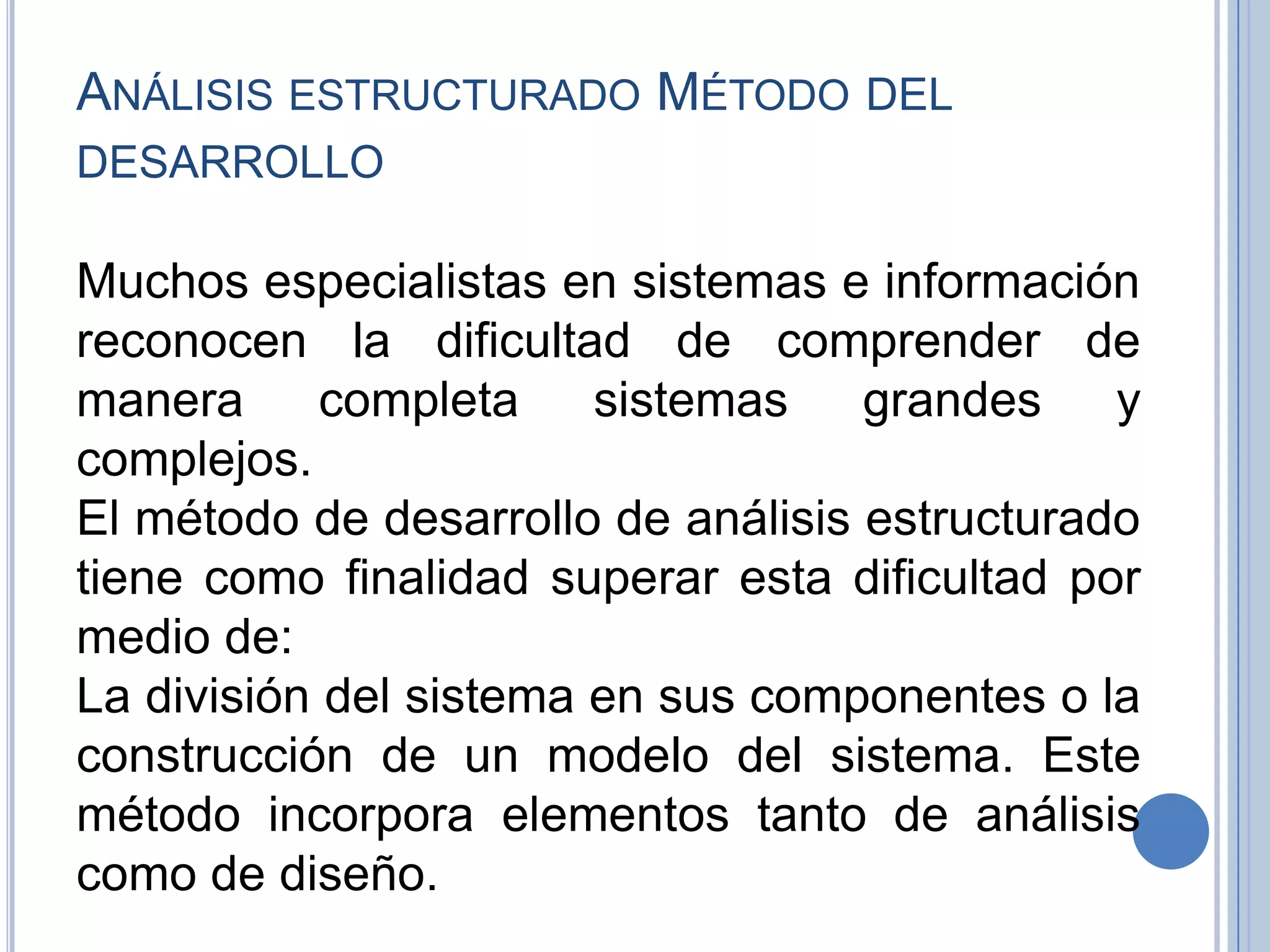 El método de análisis estructurado se enfoca en especificar los requisitos del sistema de manera lógica separada de los componentes físicos. Este método divide el sistema en componentes mediante diagramas de flujo y un diccionario de datos. Los diagramas de flujo muestran el flujo lógico de datos entre los procesos sin detalles físicos, mientras que el diccionario de datos define todos los elementos del sistema.